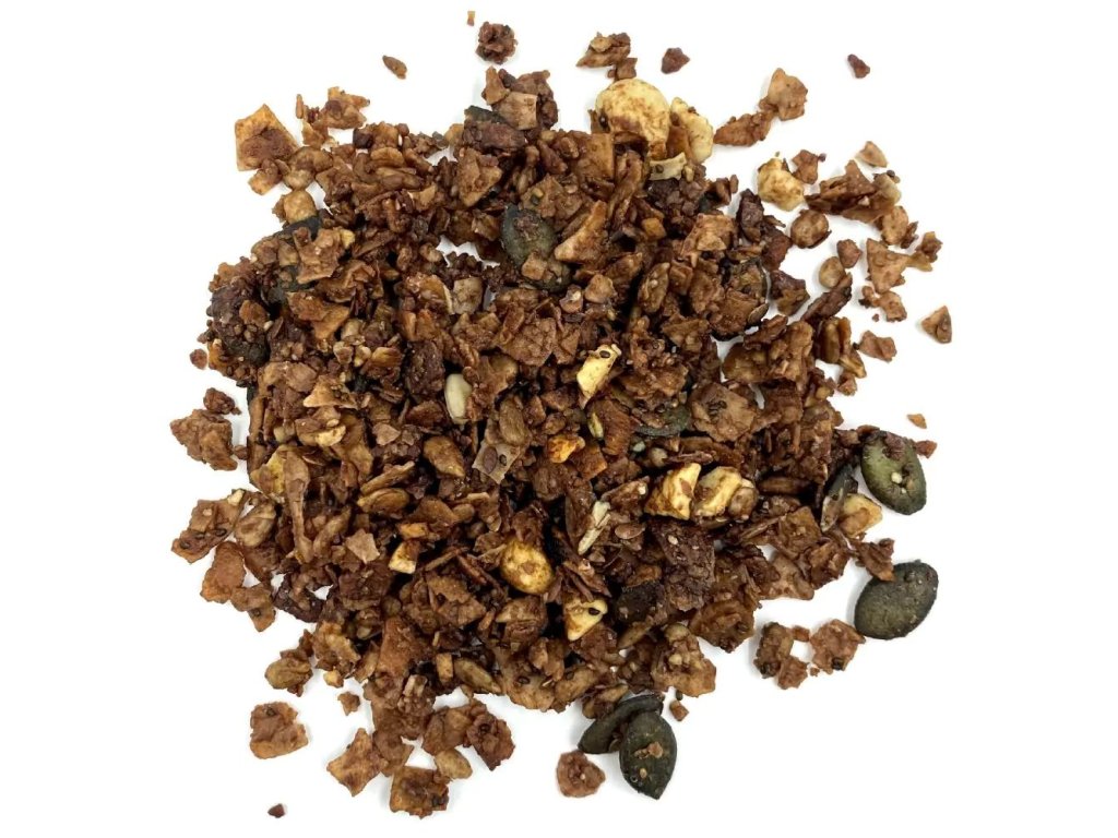 Místo vloček, které jsou běžně v granole, jsou použity kokosové chipsy. V kombinaci se semínky, oříšky a čokoládou se jedná o opravdu nezapomenutelný zážitek.