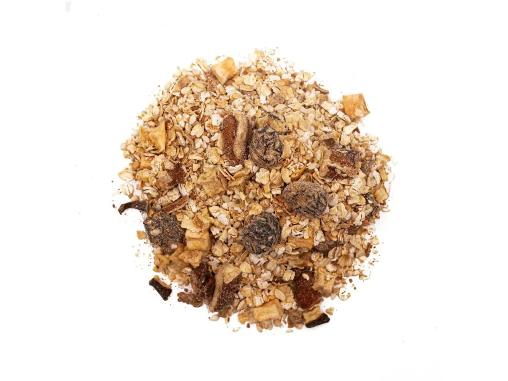 - Sušená jablka a hrušky – přinášejí jemně sladkou ovocnou chuť, aniž by bylo potřeba přidávat bílý cukr. Spolu s klikvou dodávají směsi vlákninu, vitamíny a přirozenou ovocnou svěžest.